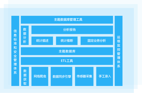 主题数据库包括原数据维护管理,ETL工具(数据抽取、转换、加载),数据维护管理、数据分析工具和系统日志五个部分。该工具为多渠道来源的数据整合,数据存储,数据分析,为数据挖掘提供了高质量的数据基础。