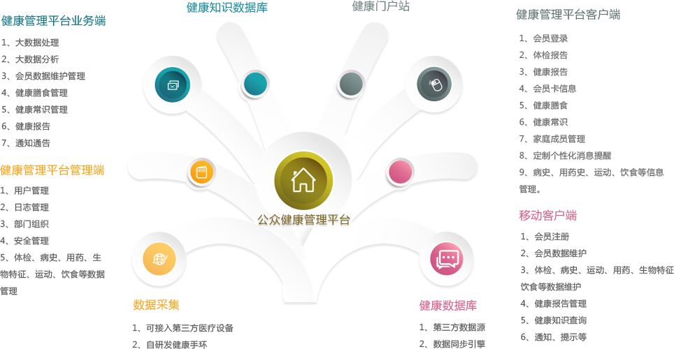 公众健康管理平台由数据采集、健康数据库、健康门户站、健康知识数据库、健康管理平台客户端、健康管理平台业务端、健康管理平台管理端、移动客户端等八大部分组成。