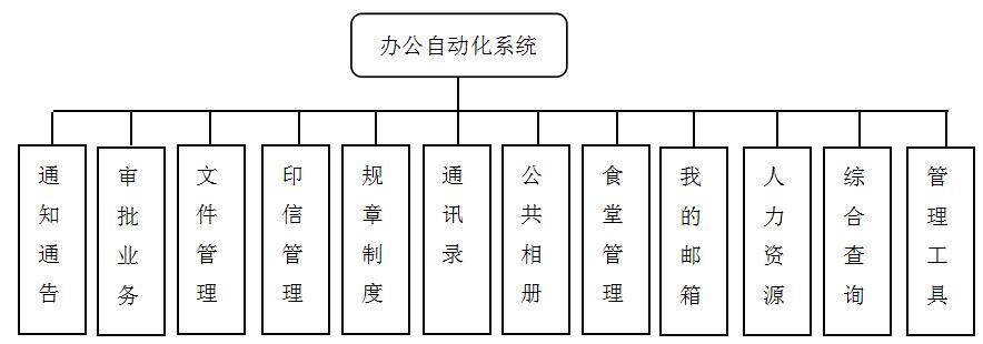 办公自动化(OA)系统包括通知通告、审批业务、文件管理、印信管理、规章制度、通讯录、公共相册、食堂管理、我的邮箱、人力资源(涵盖考勤管理和合同管理)、综合查询(涵盖库存管理和加油管理)和管理工具,见图1-3。