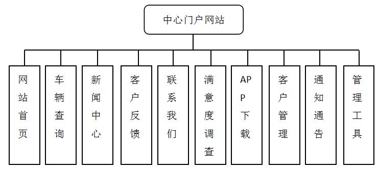 中心门户网站包括首页、车辆查询、新闻中心、通知通告、客户反馈、联系我们、满意度调查、APP下载、客户管理和管理工具,见图1-4。