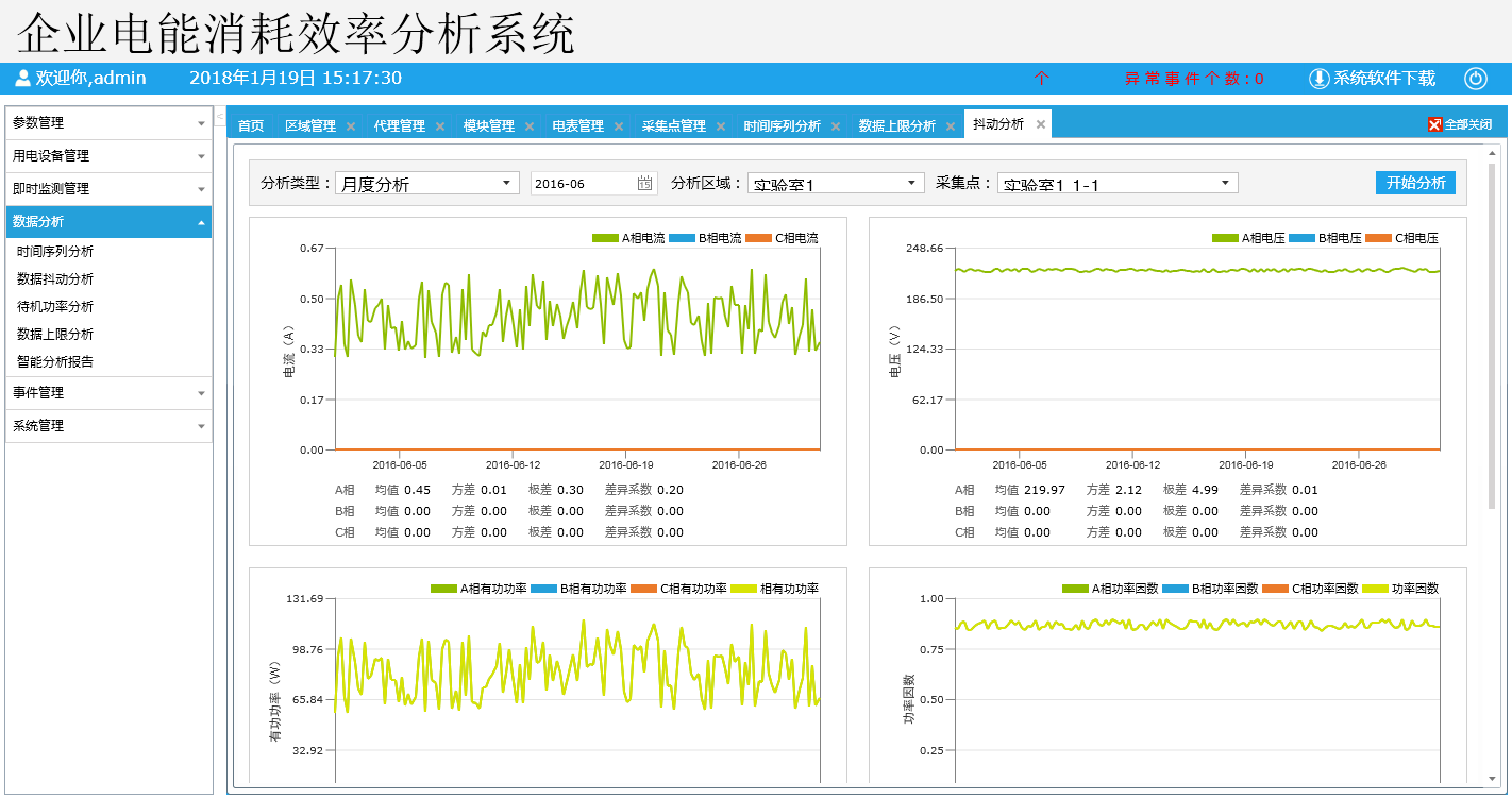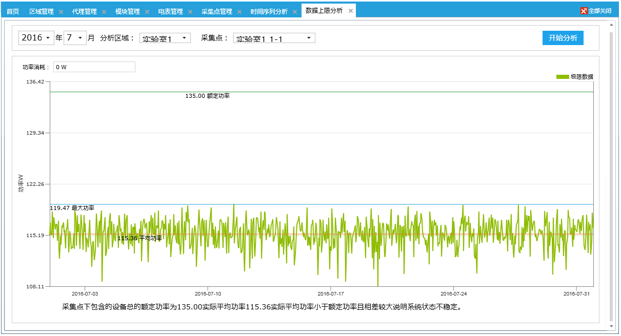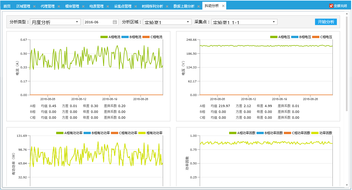 (4)数据分析:时间序列分析、数据抖动分析、待机功率分析、数据上限分析、智能分析报告