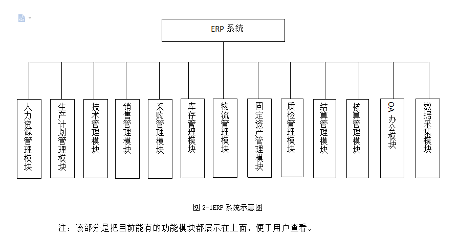 ERP系统主要包含以下十三大核心模块:人力资源管理模块、生产计划管理模块、技术管理模块、销售管理模块、采购管理模块、库存管理模块、物流管理模块、固定资产管理模块、质检管理模块、结算管理模块、核算管理模块、OA办公模块、数据采集模块等。