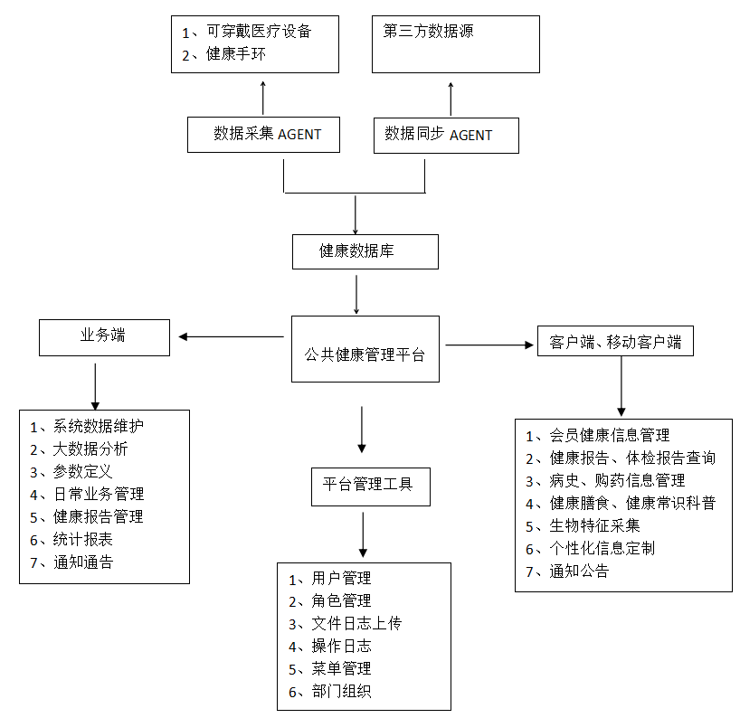 公众健康管理平台由客户端、业务端、管理工具、移动客户端、数据采集、健康数据库工具等六大部分组成。